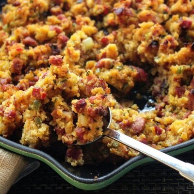 Brush a 2 quart baking dish with some of the melted butter. Drizzle remaining butter over the cornbread mixture and stir to combine. Transfer the mixture to the casserole and bake in oven for 50 minutes, stirring a few times, until browned on top.